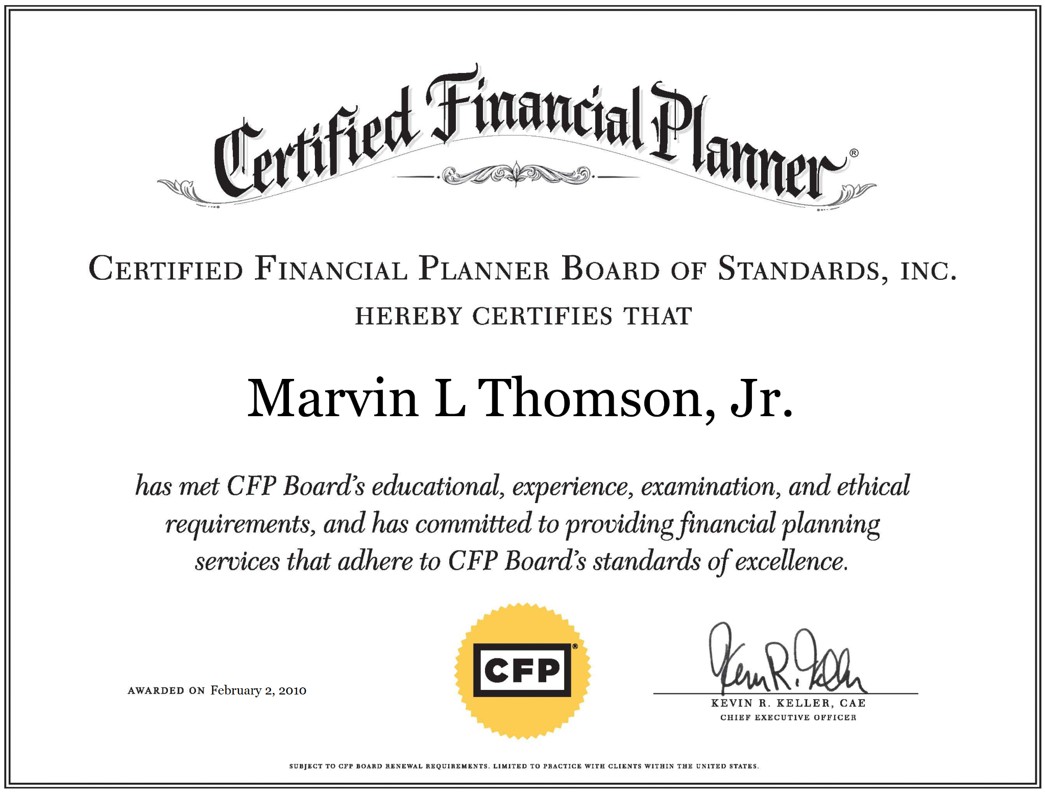 Marvin specializes in comprehensive, fee-based financial and estate planning. He earned his Series 6, 7, 24, 51, 63, 65 and Insurance Sales certifications, and in February of 2010, earned the Certified Financial Planner (CFP®) designation.